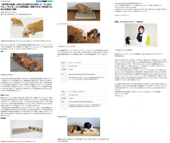 2025年12月11日 岩手日報のweb記事に、岩手 大船渡山林火災の被災木を活用した知育おもちゃの「ちょいちょいBOX」と爪とぎの「がりがりマット」が掲載されました。