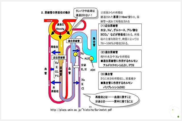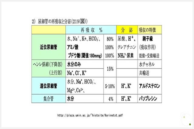 - 近位尿細管:グルコースやアミノ酸、ナトリウム、水分などの多くがここで再吸収されます。
