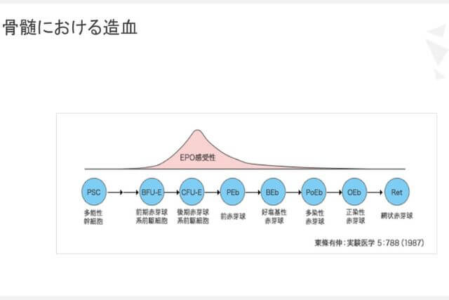 エリスロポエチンは、赤血球の産生を促すホルモンで、酸素が不足した際に腎臓から分泌されます。このホルモンは骨髄に働きかけ、幹細胞(赤血球のもとになる細胞)が赤血球へと分化・成熟する過程を促進する重要な役割を担っています。