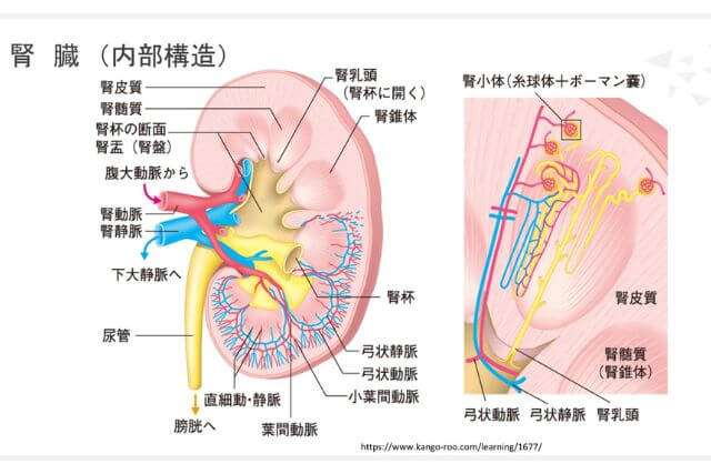 画像はヒトの腎臓の内部構造を示したものです。ネコさんも同じ構造をしています。