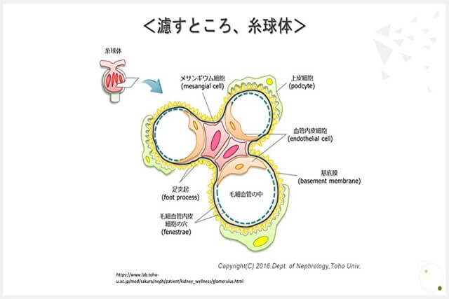 糸球体の毛細血管には内皮細胞と基底膜、外側に上皮細胞(足細胞)があります。内皮細胞には小孔があり、基底膜は網の目構造をしています。また、上皮細胞(足細胞)にはスリット膜があり、この3つの構造が重要なバリアとして、尿の中に濾過してよいものと残すものを選別しています。