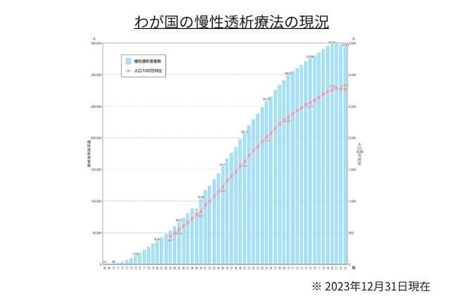 透析には1人あたり年間約400〜500万円の医療費がかかるとされ、これは社会にとっても個人にとっても大きな負担となります。