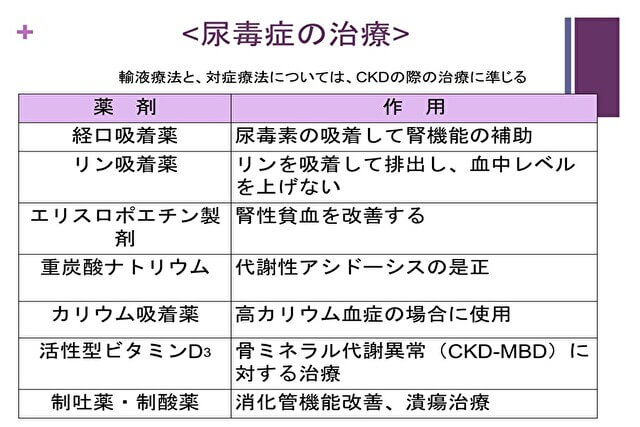 慢性腎臓病(CKD)の末期に伴う尿毒症の場合、原則として腎機能の回復は見込めず、透析や点滴などの継続的な治療が必要です。