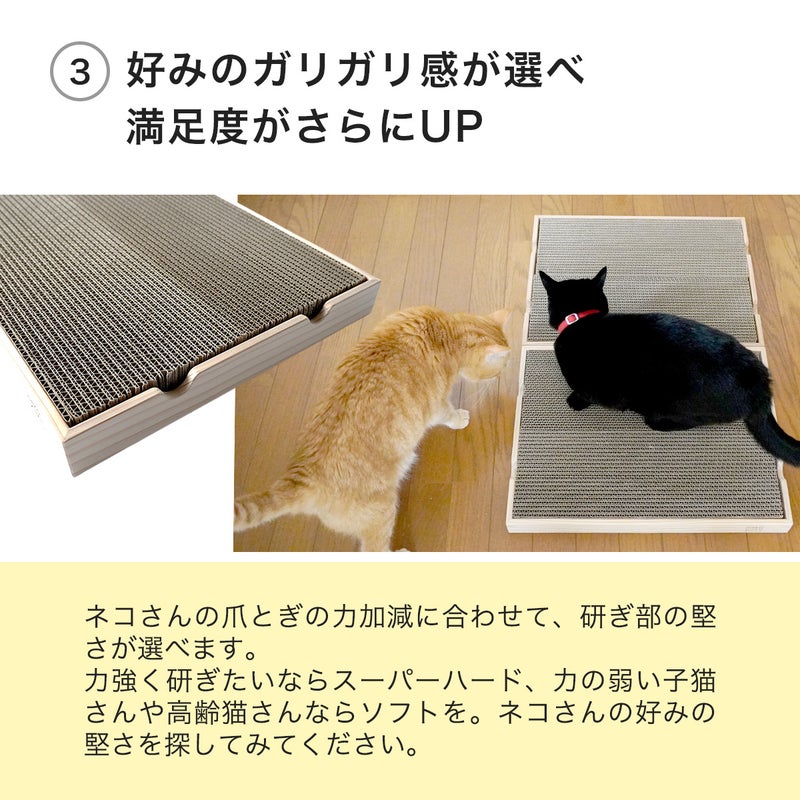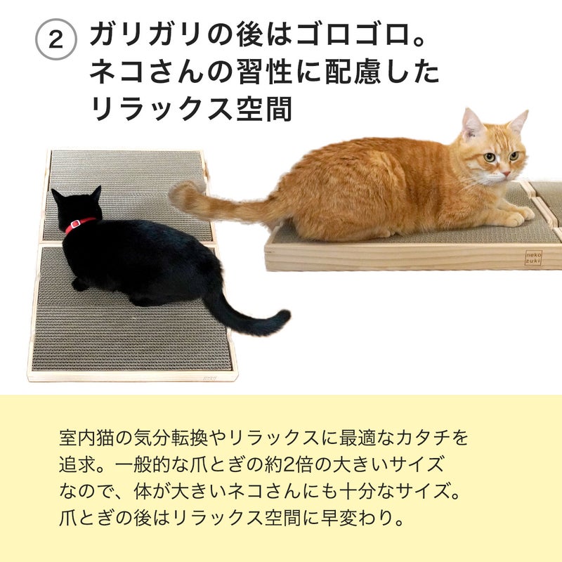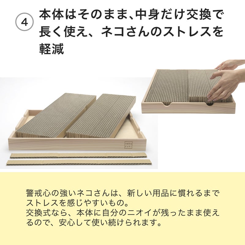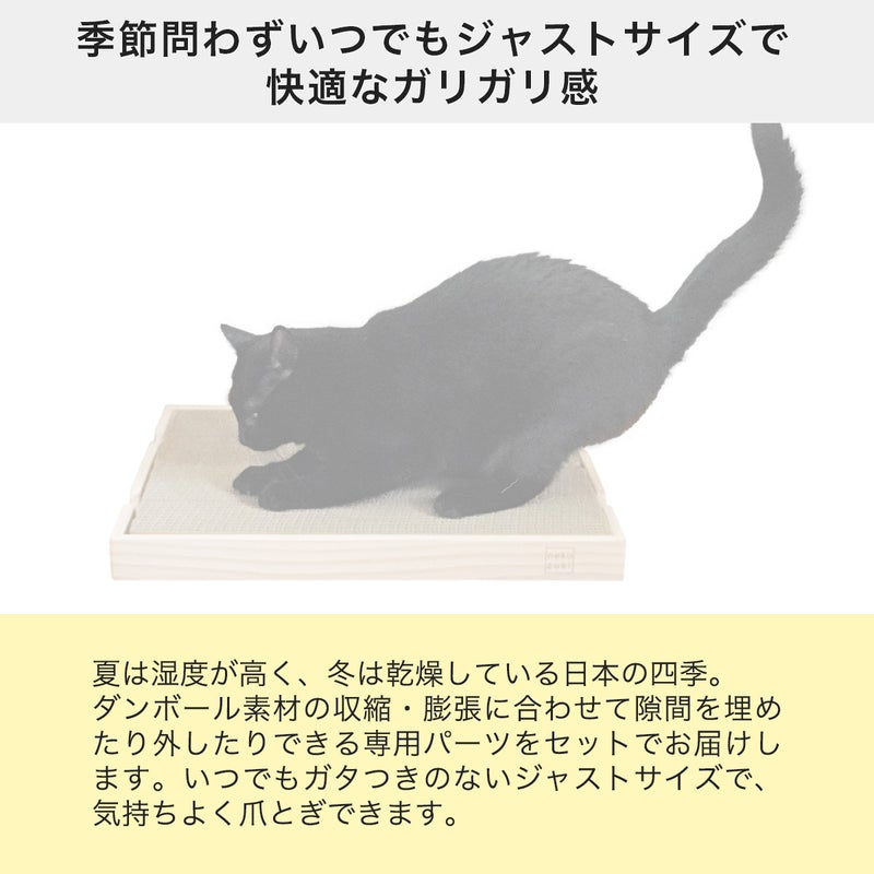 夏は湿度が高く、冬は乾燥している日本の四季。ダンボール素材の収縮・膨張に合わせて隙間を埋めたり外したりできる専用パーツをセットでお届けします。いつでもガタつきのないジャストサイズで、気持ちよく爪とぎできます。