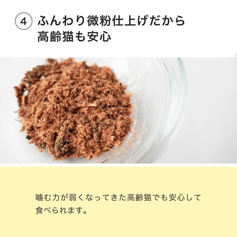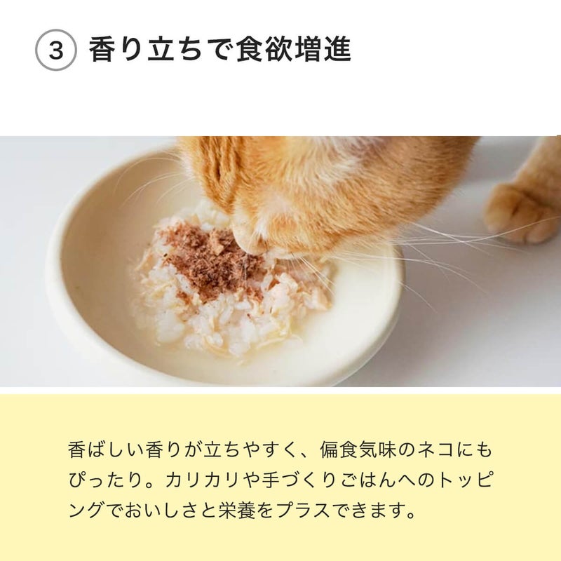 細かく砕いたふりかけは、香ばしい香りが立ちやすく、偏食気味のネコにもぴったり。カリカリや手づくりごはんへのトッピングでおいしさと栄養をプラスできます。