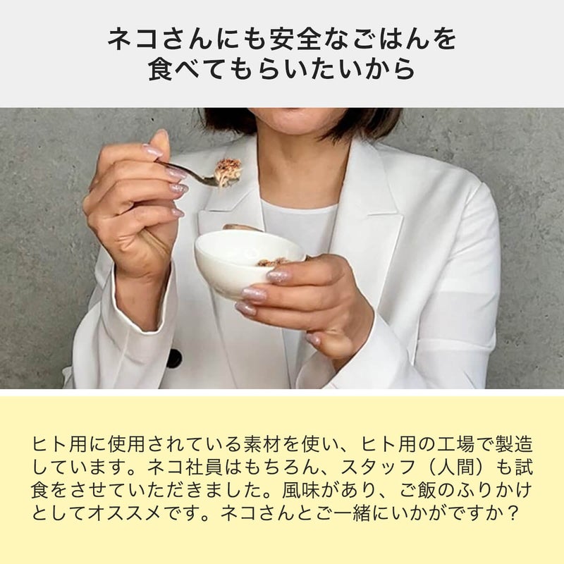 ヒト用に使用されている素材を使い、ヒト用の工場で製造しています。ネコ社員はもちろん、スタッフ(人間)も試食をさせていただきました。