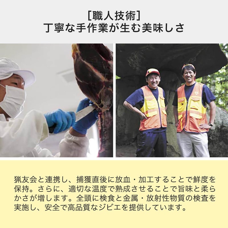 遠野猟友会の協力のもと、捕獲後すぐに放血・冷却・加工を行い、臭みが出ないよう丁寧に処理。さらに熟成工程で旨味を引き出しました。