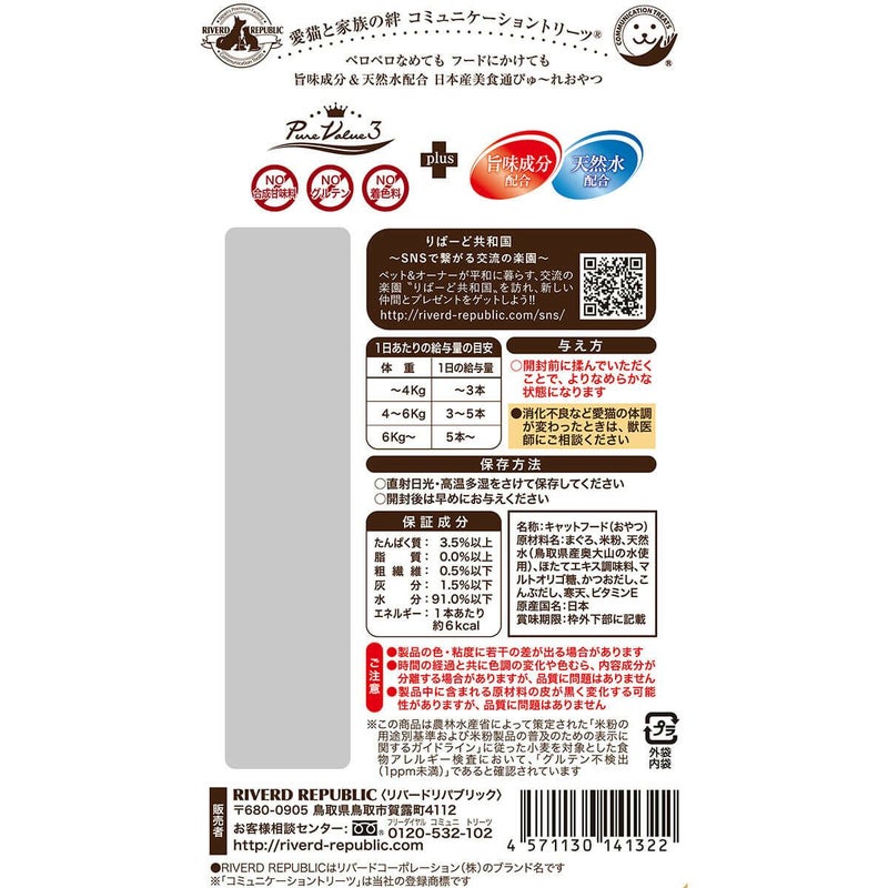 ペロペロなめても フードにかけても まぐろ&玄米粉のみ使用 日本産無添加ぴゅ~れおやつ 自社工場から直送 絆をつくる 絆をつなぐ コミュニケーショントリーツ ねこぴゅ~れ 無添加ピュア PureValue5 まぐろ おやつ トリーツ 4本 13g