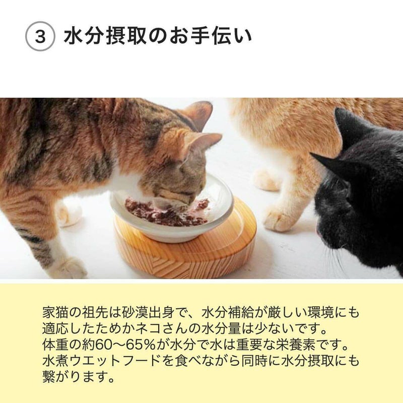 そんなときは、水煮タイプのウエットフードが役立ちます。食事を楽しみながら、自然に水分摂取にもつながります。