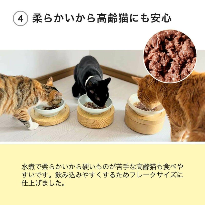 水煮でやわらかい仕上がりなので、噛む力や飲み込みが弱くなったシニア猫にもやさしいごはんです。フォークや箸でカンタンにほぐれます。お好みの大きさにで与えてください。