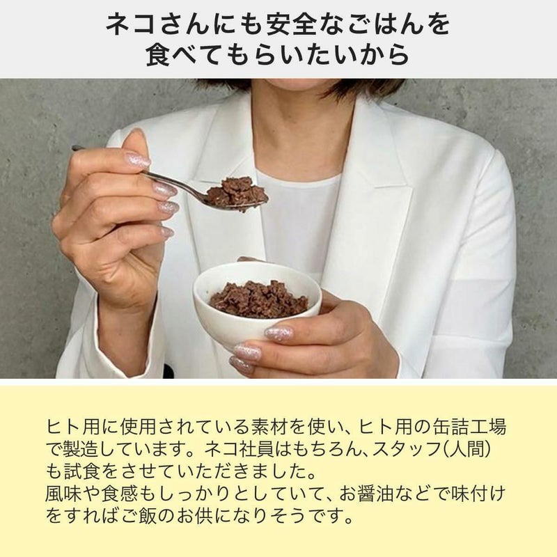 ヒト用に使用されている素材を使い、ヒト用のパウチ工場で製造しています。ネコ社員はもちろん、スタッフ(人間)も試食をさせていただきました。