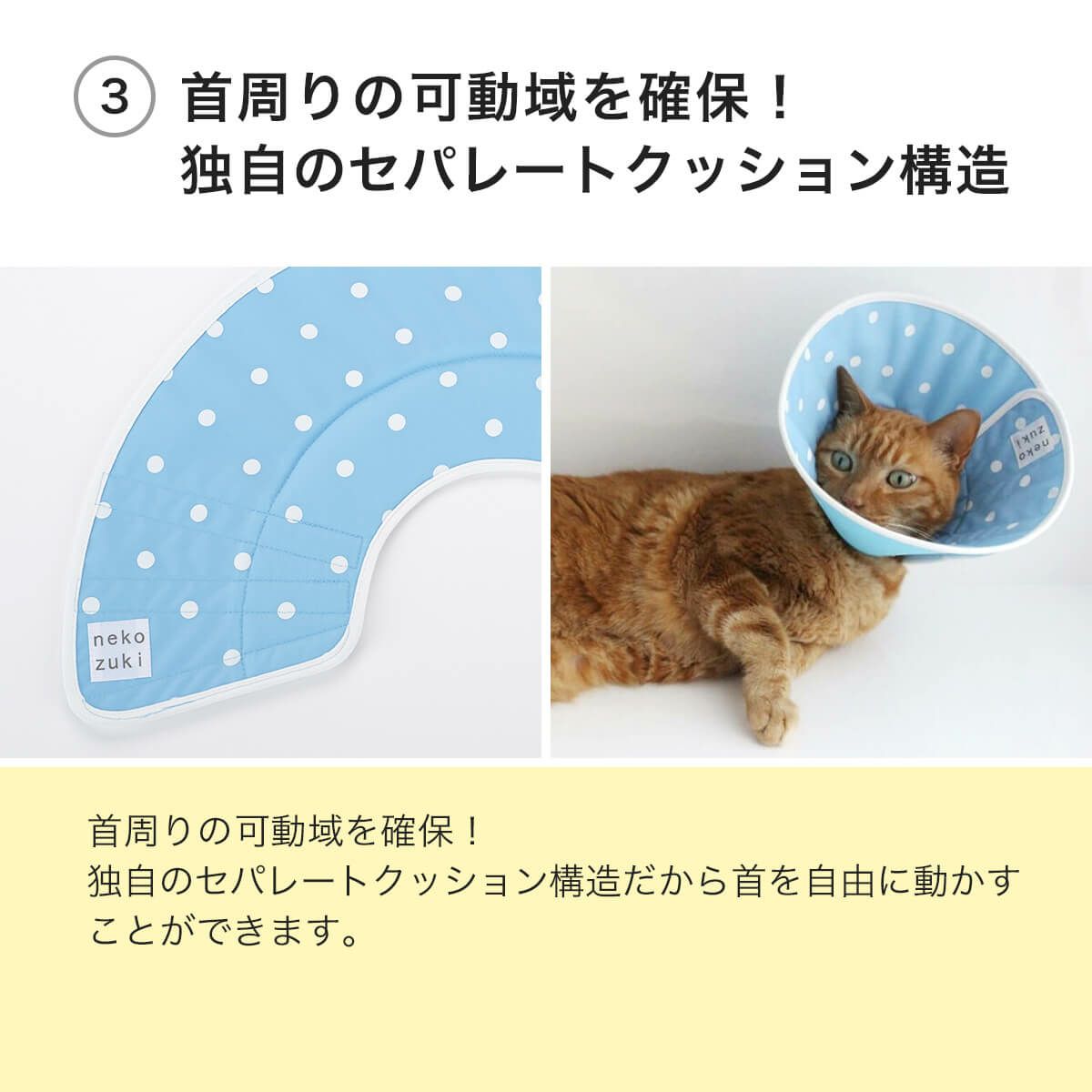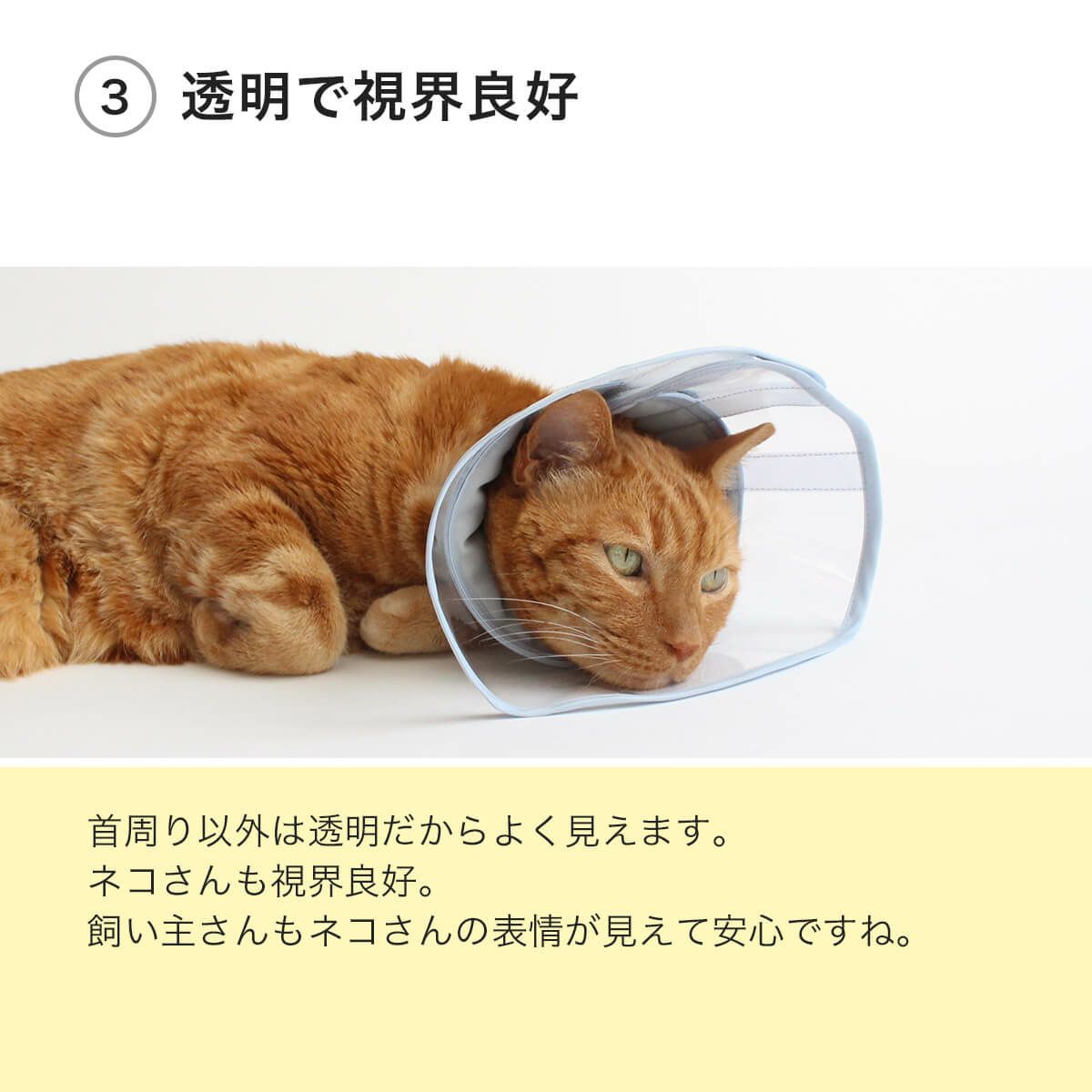 猫の負担軽減を考えて作られているのが伝わってくる、とても良い商品でした。すごく軽くて柔らかい猫の首に当たる部分は柔らかくクッション入りで、透明なカラー部分と言えばいいのでしょうか?そちらも思っていた以上に柔らかめのソフト素材で、猫が寝る時も寝やすそうです。一度、動物病院から借りたカラーは、下敷きの様な素材で硬く重めで、5、6個のボタンで留めるタイプだったので付けるのも大変でした。その点こちらはマジックテープなので、双方負担なく簡単に付けられてとても有難いです。