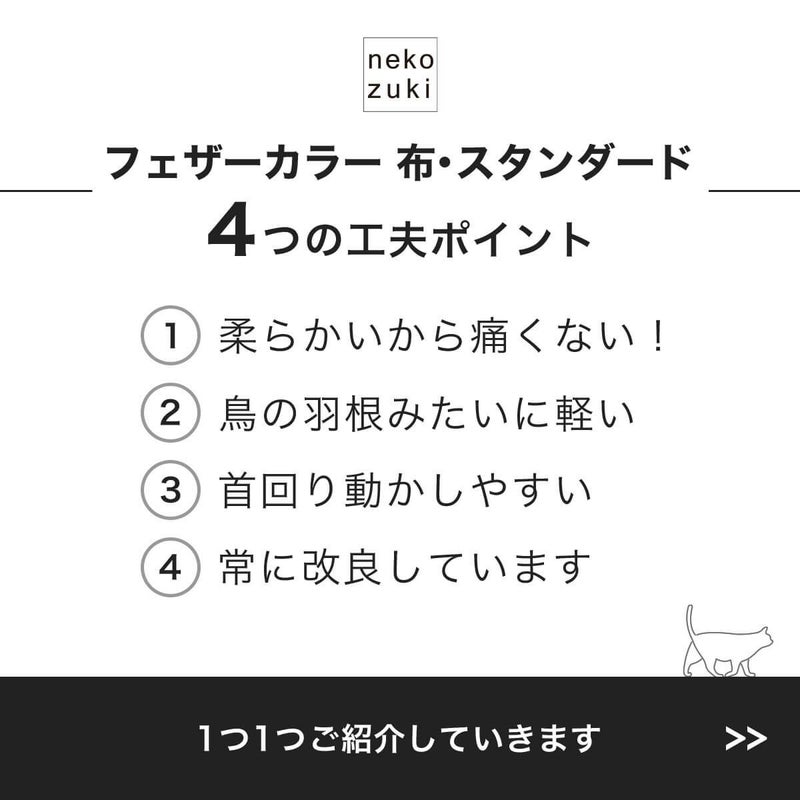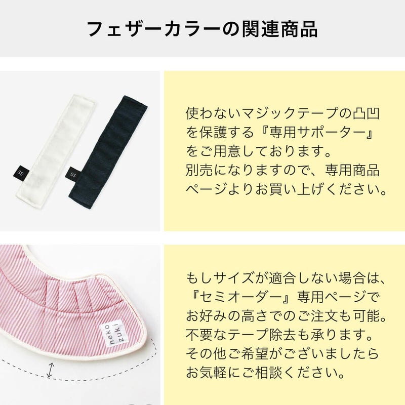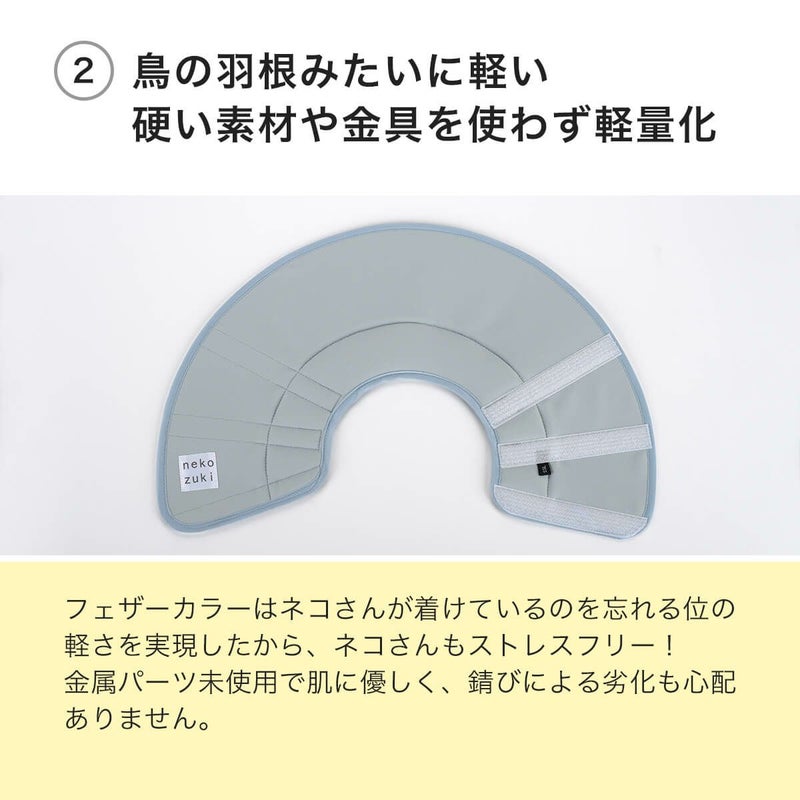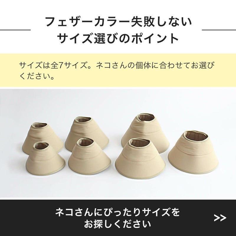 猫さんが余分な重みを感じないように猫用品専門店が開発!エリザベスカラーとは怪我をした時に首に巻く保護具です。体のサイズにフィットした feathercollar(フェザーカラー)を使って、ネコの体への負担を少しでも減らしたい。という思いから軽い軽量なつくり。お客さまの声から豊富なサイズが生まれました。岩手の職人の縫製技術が本製品の機能を支えています。職人の技術が可能にしたリバーシブルタイプなので気分にあわせて無地と柄のデザインを選べます。種類豊富なおしゃれなデザインで少しでも快適な生活を送って欲しいです。ソフトな素材のマジックテープを採用3段階サイズ調整が可能です。着脱、着け外しも楽です。猫の毛が絡みにくいのも、このエリザベスカラーの特徴です。やわらかい素材で着けたままでも行動が制限されることなく動きやすいです。お昼寝、寝れる、水飲む、食事ができ痛くない優しい作りです。首周りには衝撃吸収の綿入れ(クッション)が入っているのでお留守番も安心、ストレスを軽減します。透明で視界良好、ライトなエリザベスカーラーは家具にぶつかったり引っかかる心配がありません。