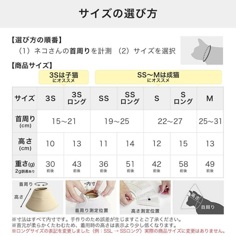 商品サイズ 小さめ~大きめまで猫専用7サイズ(3S・3Sロング・SS・SSロング・S・Sロング・M)手作り品のためサイズには誤差が生じますこと予めご了承ください。仔猫、成猫、高齢猫さんまで豊富なサイズを用意しています。