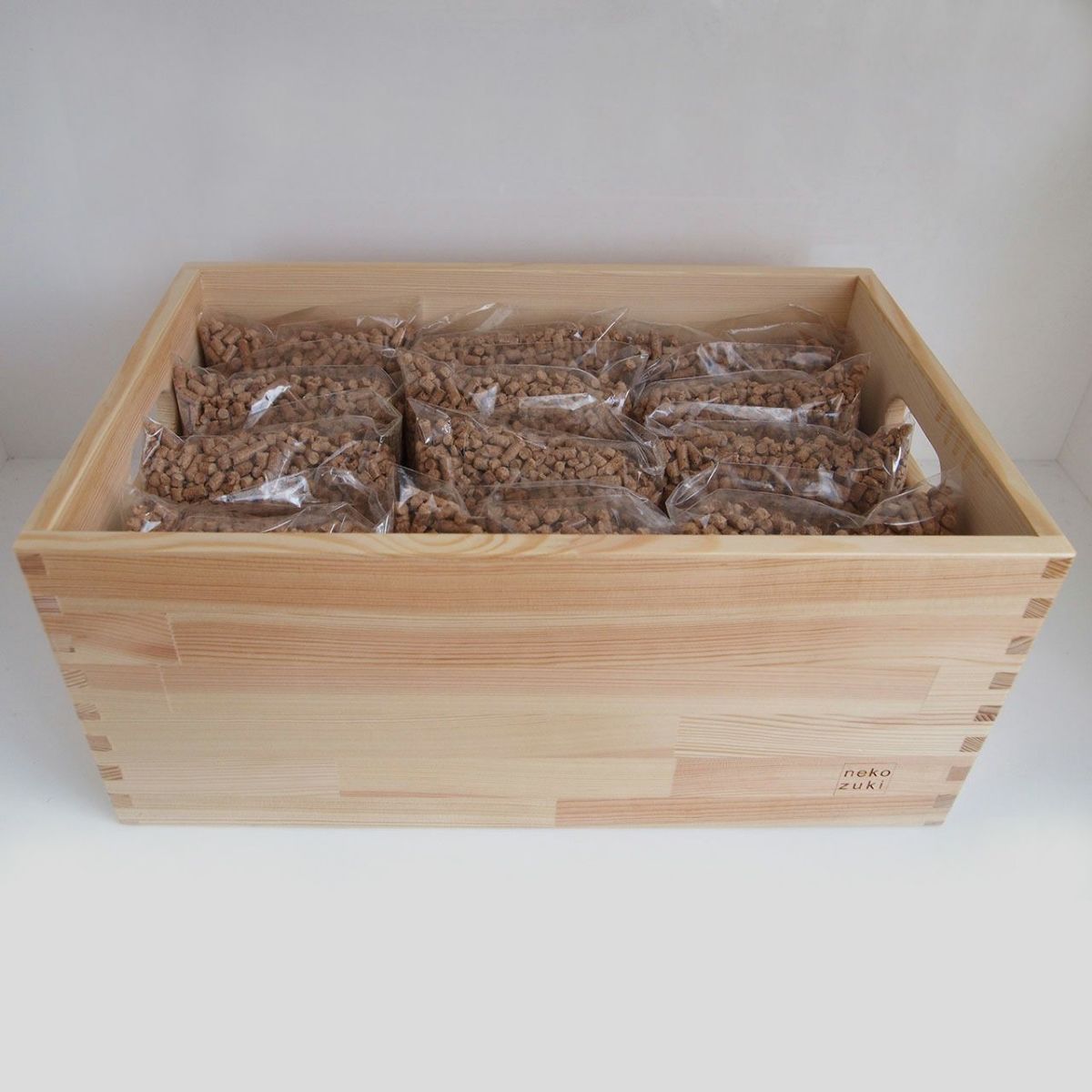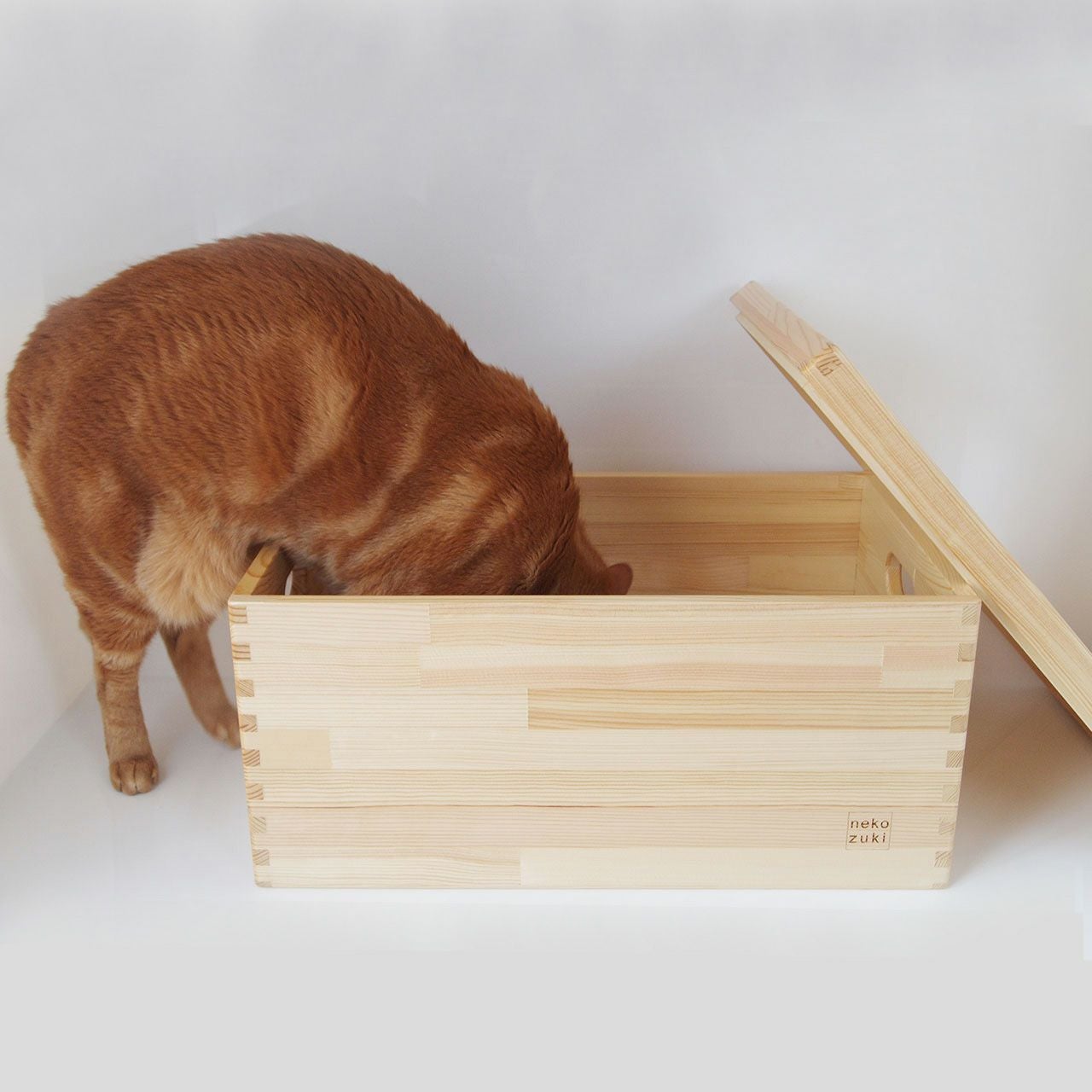 ネコさんとの暮らしに欠かせないトイレ用品やケアアイテム、おもちゃをすっきり収納できる「T-Box」。毎日使う猫砂やトイレスコップ、ブラシや爪切りを整理整頓でき、使い方は自由自在。岩手県産の南部アカマツを贅沢に使用した木製収納ボックスで、水に強く、温もりのある美しい木目が特徴。インテリアになじむ国産木材の収納箱は、時と共に味わいが増します。移動が楽な持ち手付きで、手触りが良いのも魅力。機能性とシンプルで飽きないおしゃれなデザインの収納ボックスです。