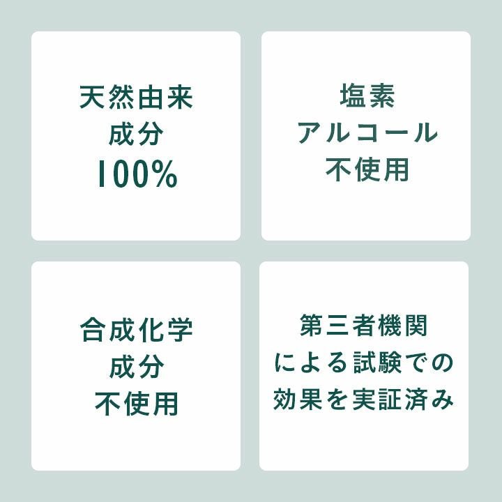 メカニズム 3つのキー成分がニオイや細菌、ウイルス、ダニ*に効果を発揮。原因物質に超微粒子が吸着し、働きかけることで消臭&除菌します。 超電解イオン水 超高圧粉砕加工で電気分解をしたナノイオン水が、ニオイ分子や原因菌に作用。 複合アミノ酸 天然由来の複合アミノ酸。悪臭の原因に結合して消臭&除菌。 天然フィトンチッド 樹木から発散される芳香成分。悪臭の原因に結合してニオイを中和分解。 効果実証・安全性 第三者機関による効果実証データを取得済み。 成分のやさしさと効果を追求し、限りなく水に近い成分でありながら第三者機関による効果実証データを取得しています。 様々なニオイの原因を99.9%除去 ・ホルムアルデヒド ・トリメチルアミン ・アンモニア ・メチルメルカプタン ・イソ吉草酸 ・アセトアルデヒド (ガステック法、ティッピング法による消臭試験) ・ダニを77%以上忌避* ・約20種類以上の原因菌・ウイルスで除菌力を試験済 第三者機関での効果を実証済 *不快害虫ヤケヒョウヒダニ用、第三者機関にて効果測定実施済、使用環境により十分な効果が得られないことがあります。 安全性試験をクリア ・経口による毒性試験 ・皮膚の刺激性試験 ・アレルギー検査