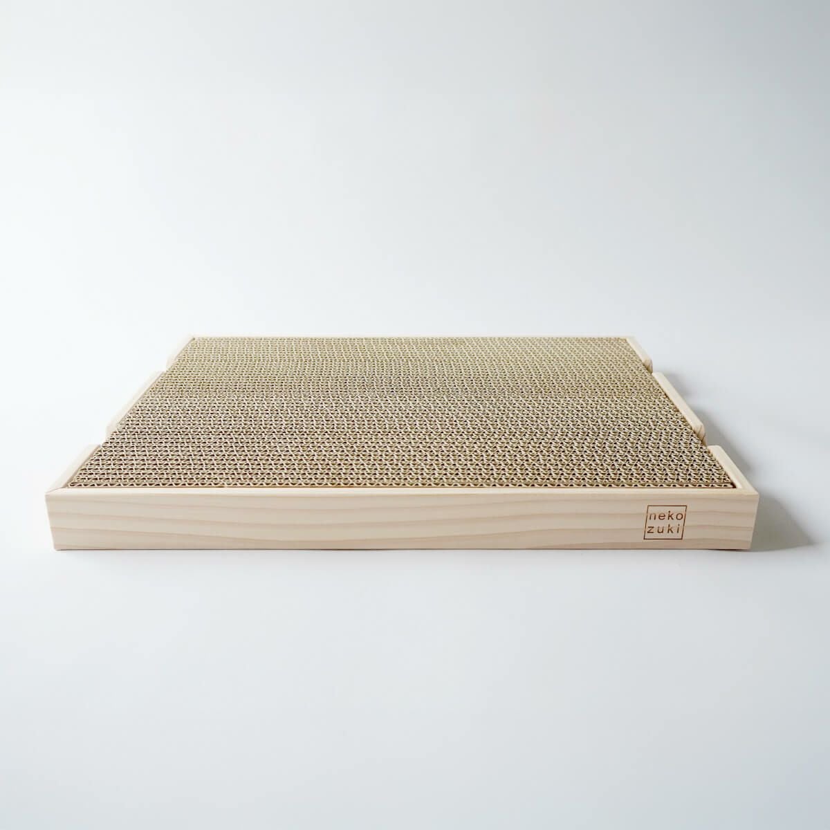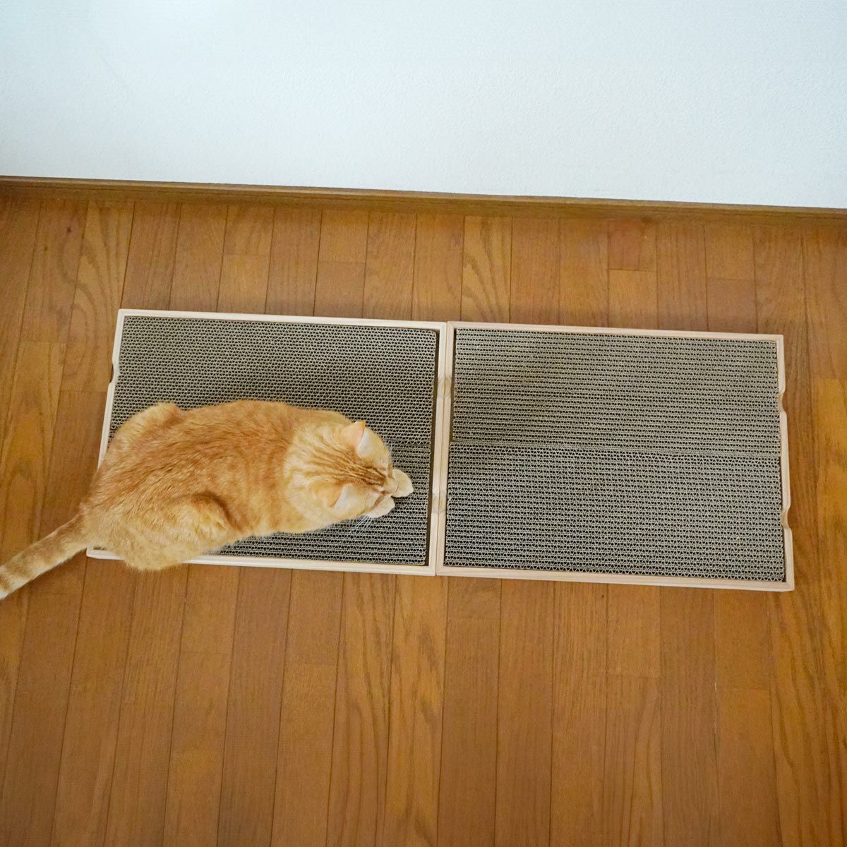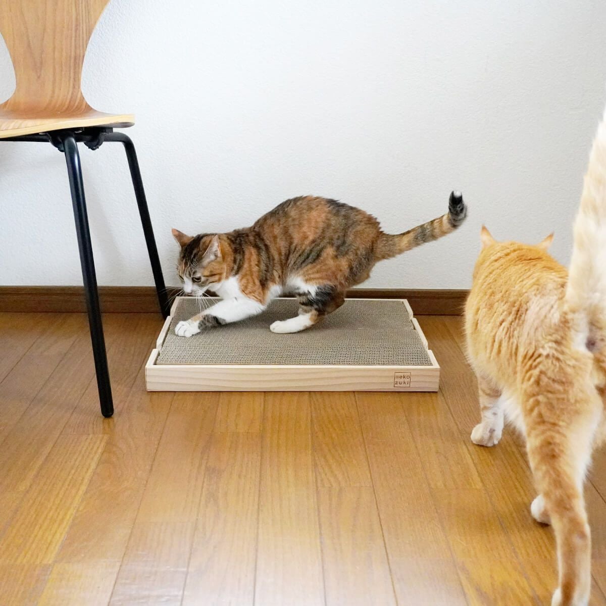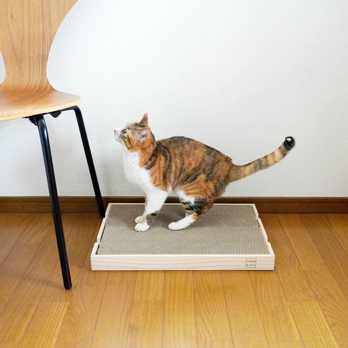 床置き型の爪とぎ『がりがりボード』はダンボールを2枚横並びに設置するので、ネコがのびのびと爪とぎできストレス解消。子猫から高齢猫までずっと長く使える国産の木製家具です。