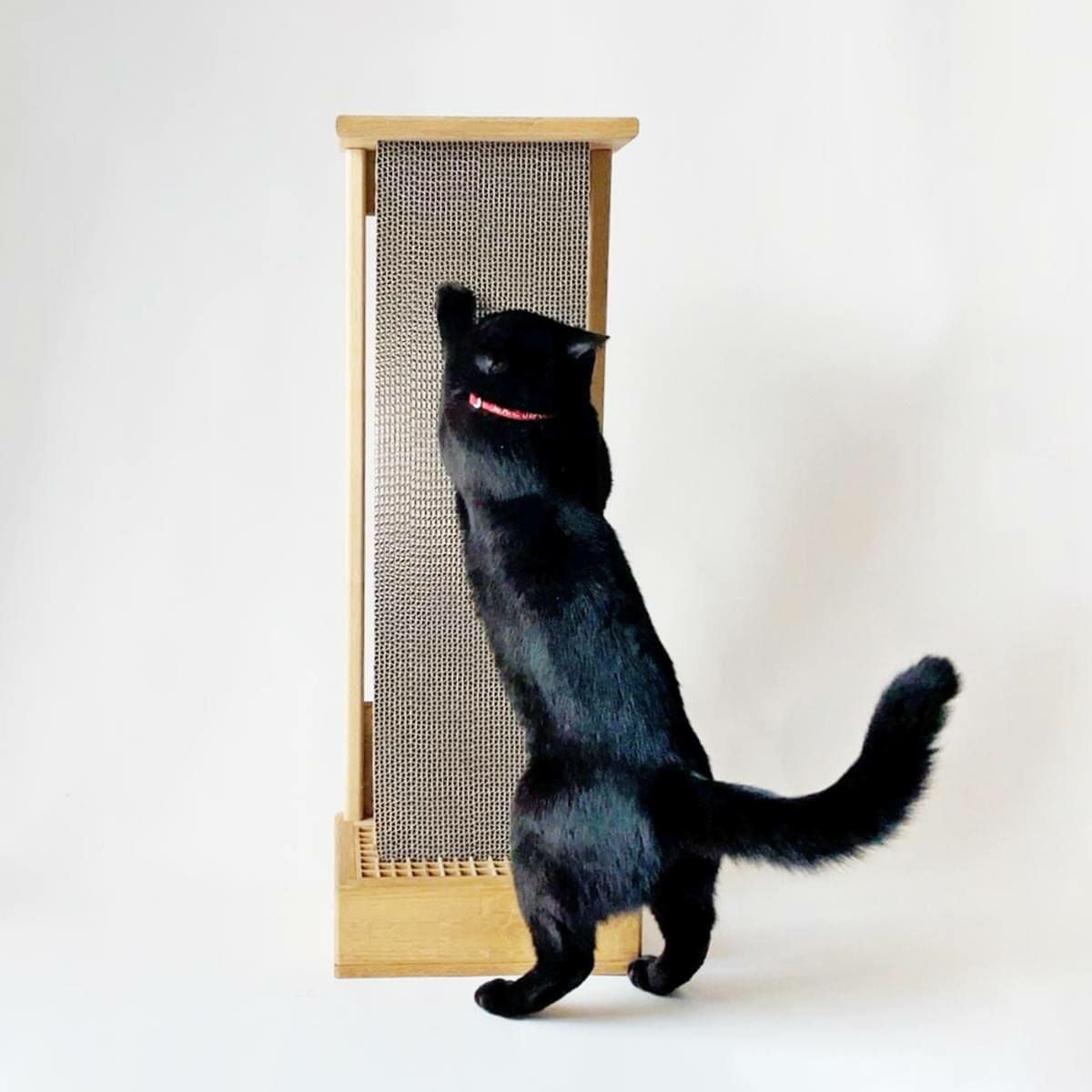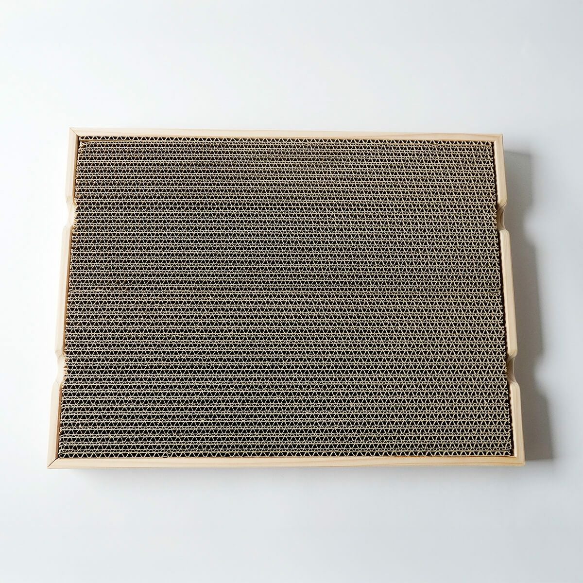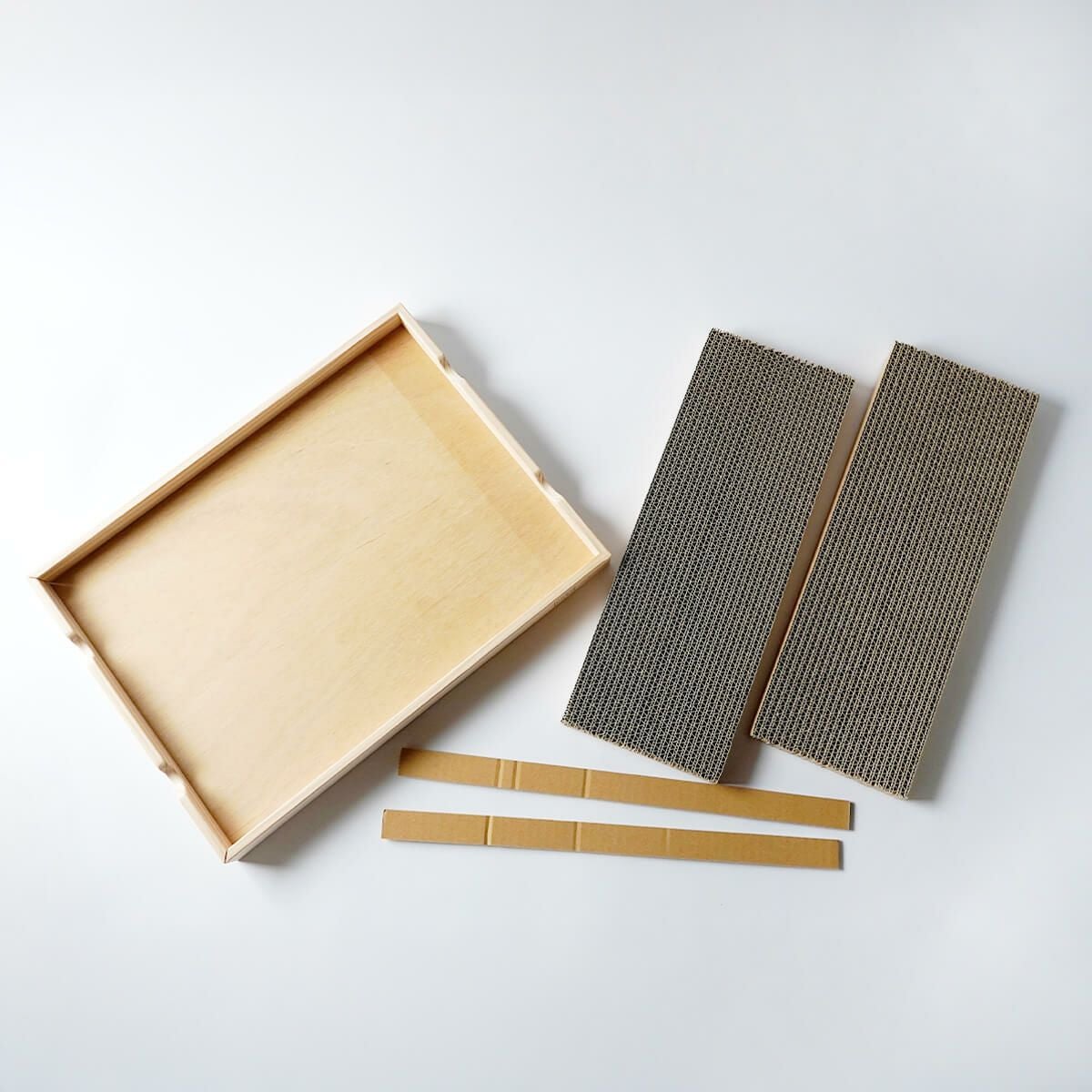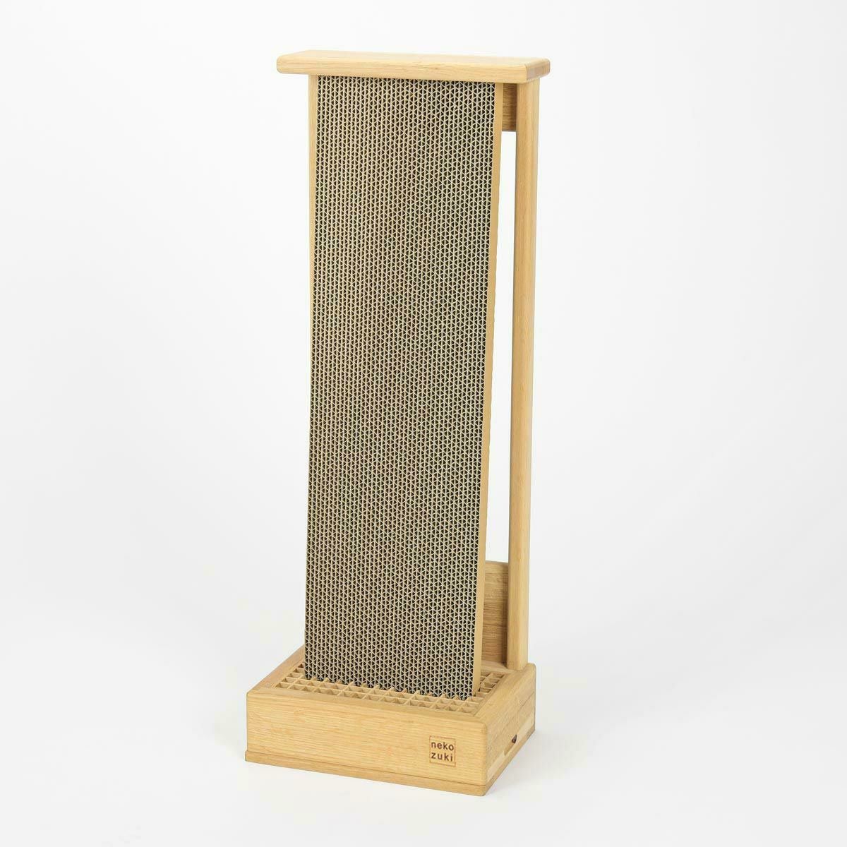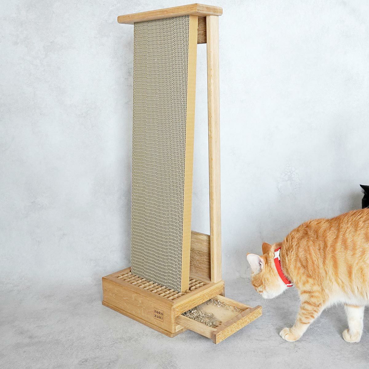 床置き型の爪とぎ『がりがりボード』はダンボールを2枚横並びに設置するので、ネコがのびのびと爪とぎできストレス解消。子猫から高齢猫までずっと長く使える国産の木製家具です。