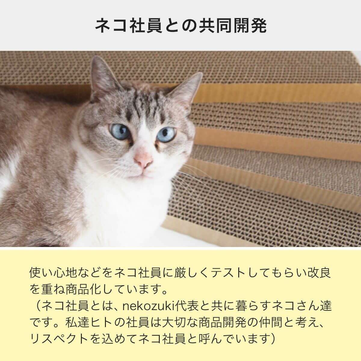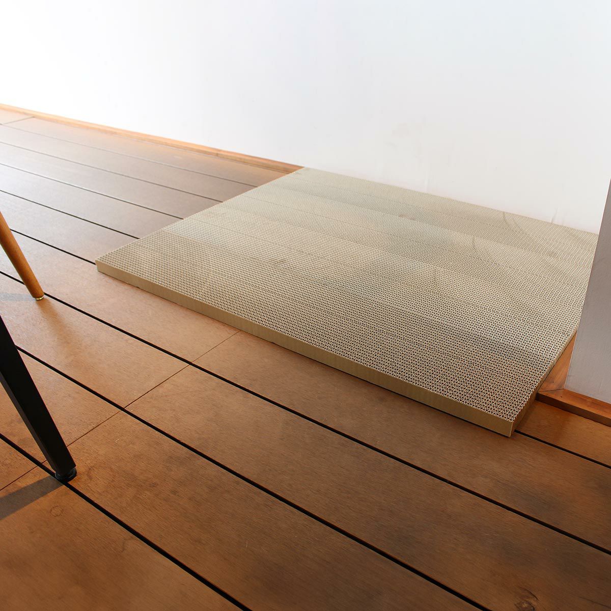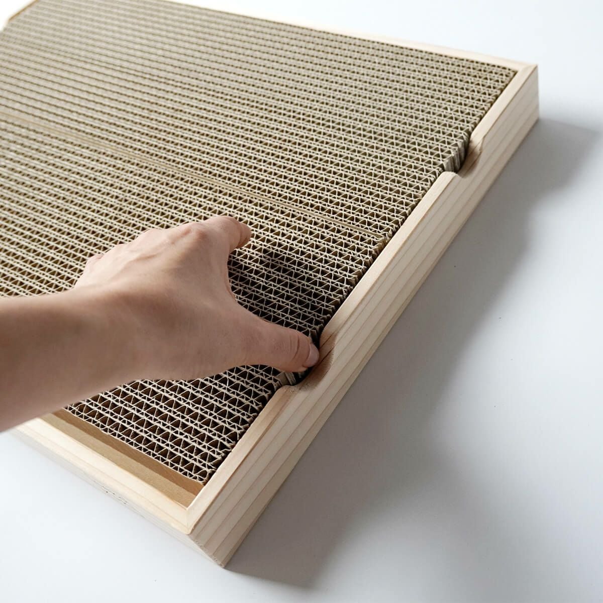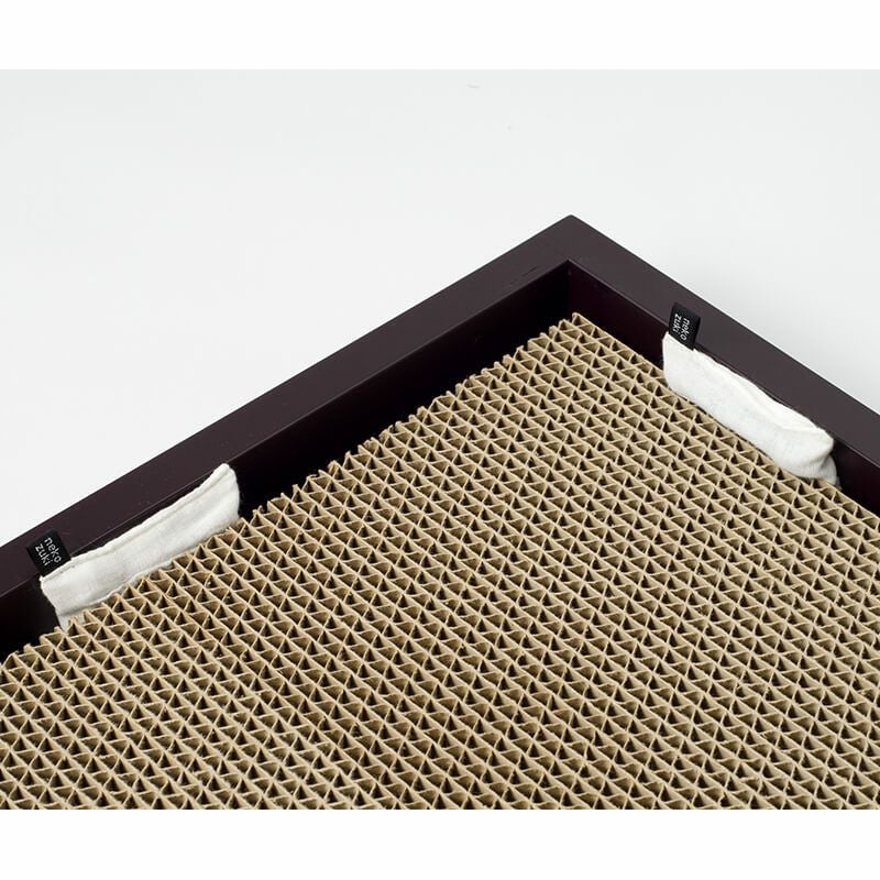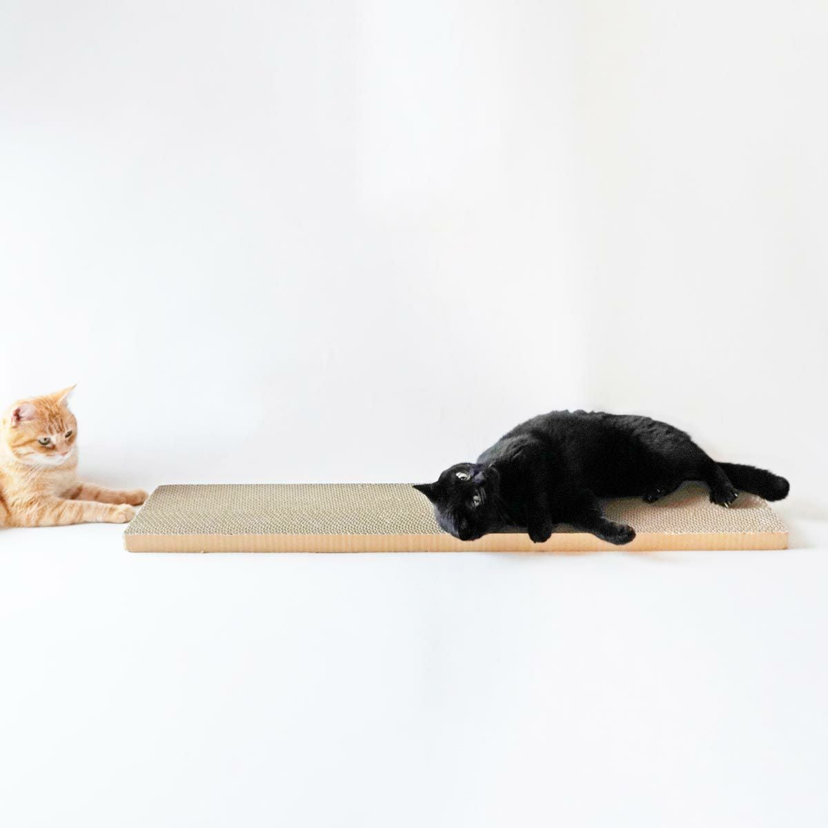 床置き型の爪とぎ『がりがりボード』はダンボールを2枚横並びに設置するので、ネコがのびのびと爪とぎできストレス解消。子猫から高齢猫までずっと長く使える国産の木製家具です。