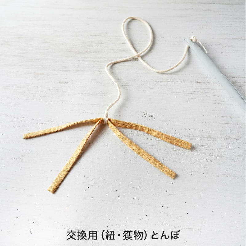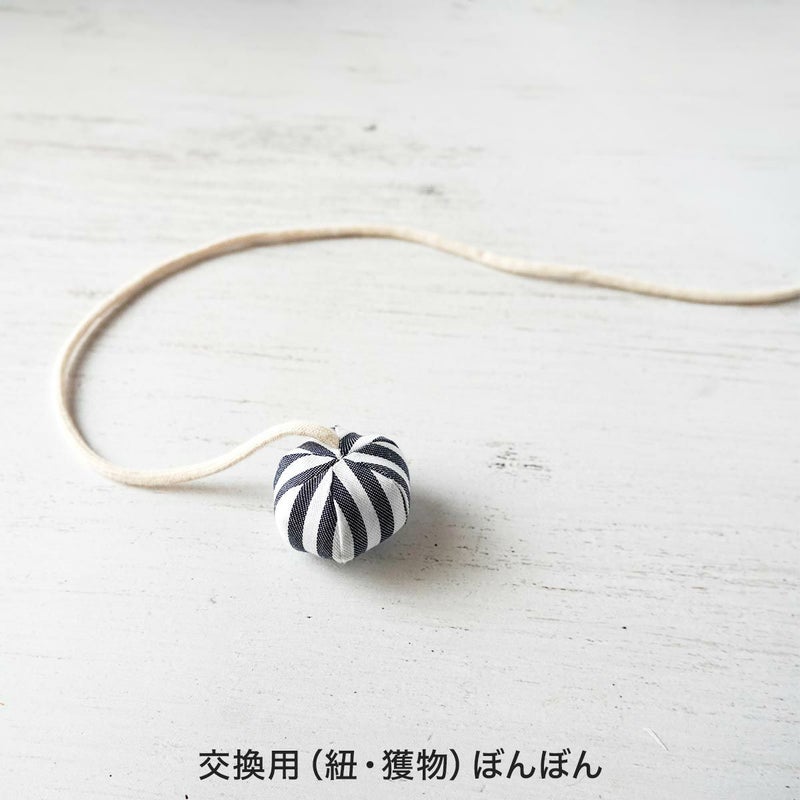 飼い主さんご自身が愛猫さん好みの獲物を作って取り付けられるよう、スペアの紐を1本プレゼントしています。