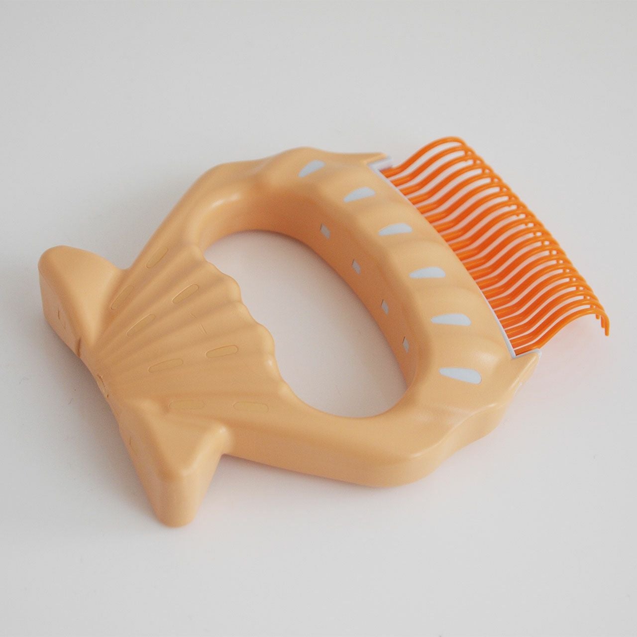カーブ型のクシ歯の弾力と先を丸めた弾力のあるピンはまるで手ぐしみたいで肌に優しく、大きくたわむクシ歯は無理に毛をひっぱる事なく毛をときほぐすから肌と被毛を痛めません。取れた毛はピン先に固まるので後は外し取るだけ。お掃除もカンタンです。毛の長さによって選べる「やわらかめ」と「長め」をご用意しています。