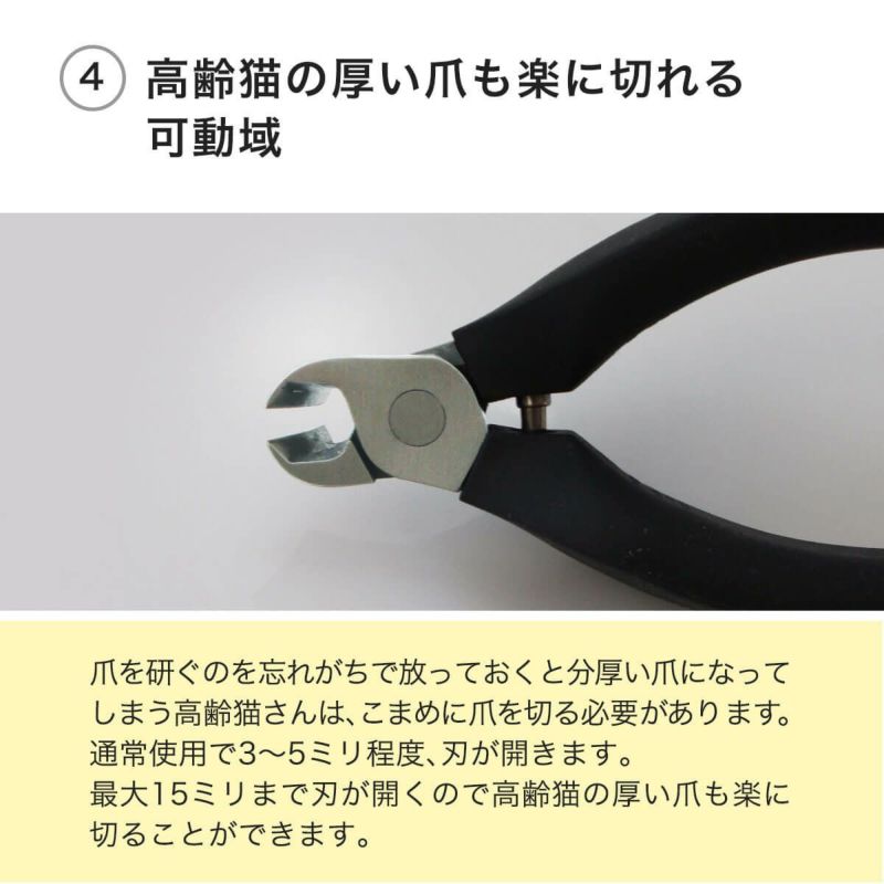 爪を研ぐのを忘れがちで放っておくと分厚い爪になってしまう高齢猫さんは、こまめに爪を切る必要があります。爪が厚くなる前に爪きりを習慣化。シリンダーバネを採用し通常使用で3~5ミリ程度、刃が開きます。最大15ミリまで刃が開くので高齢猫の厚い爪も楽に切ることができます。