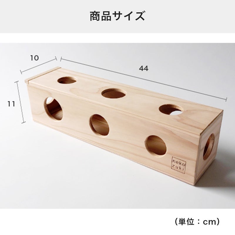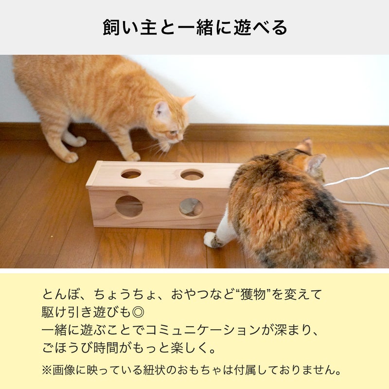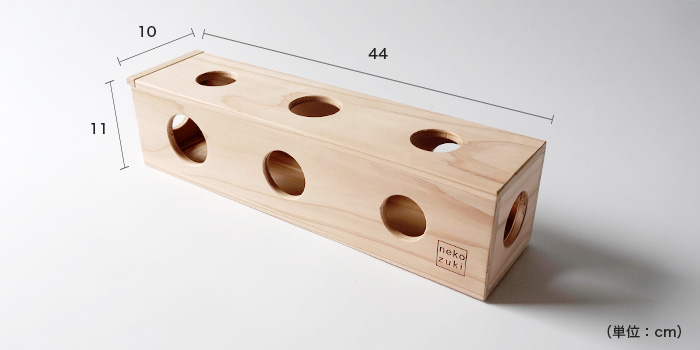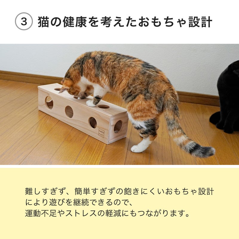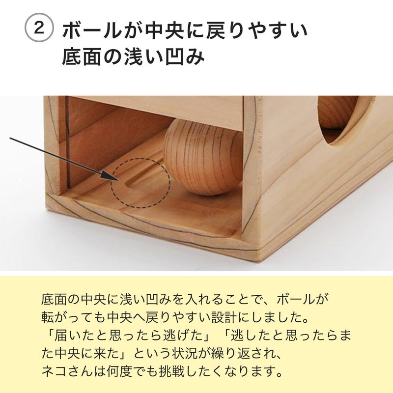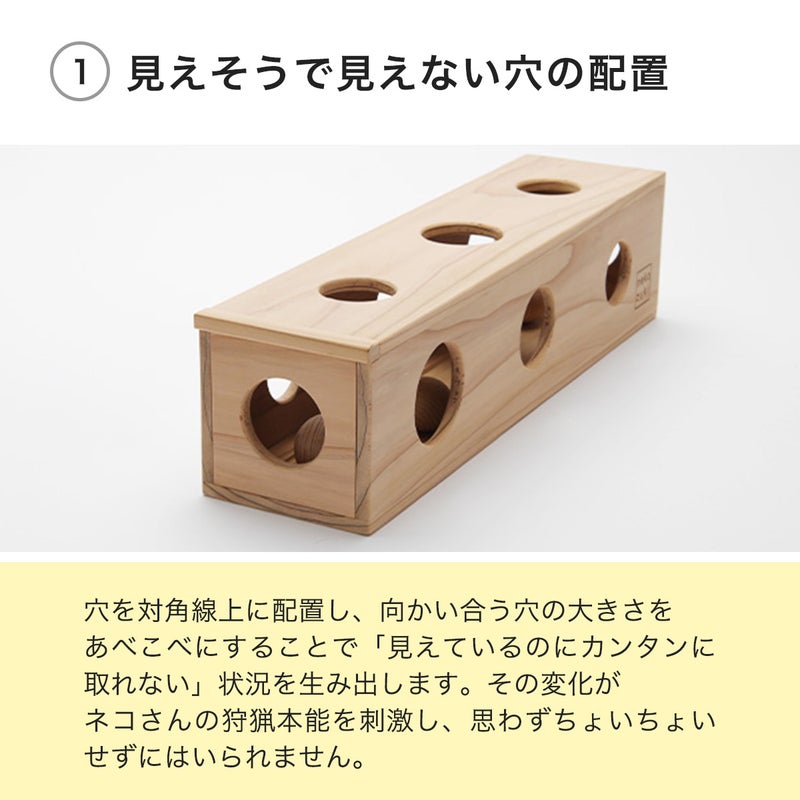 穴を対角線上に配置し、向かい合う穴の大きさをあべこべにすることで「見えているのにカンタンに取れない」状況を生み出します。その変化がネコさんの狩猟本能を刺激し、思わずちょいちょいせずにはいられません。